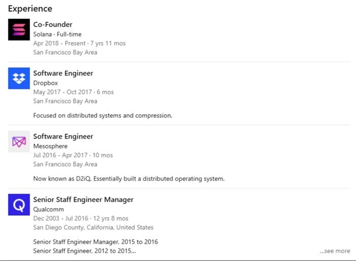 Yakovenko's academic background focused on distributed systems and compression algorithms, technical areas that later proved crucial to his innovations in blockchain. According to his LinkedIn profile (shown below), after graduation he joined Qualcomm, where he worked on operating system-level software and distributed systems for over a decade, a period he himself might call being a "grunt" or workhorse. However, this experience at a leading communications technology company gave Yakovenko deep expertise in building systems that handle large-scale, high-throughput operations.