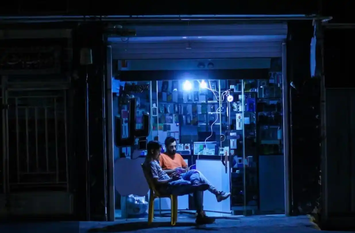 Image description: Two Iranian men sit outside their mobile phone shop, with only emergency lights on inside, as a power cut leaves the street in darkness.