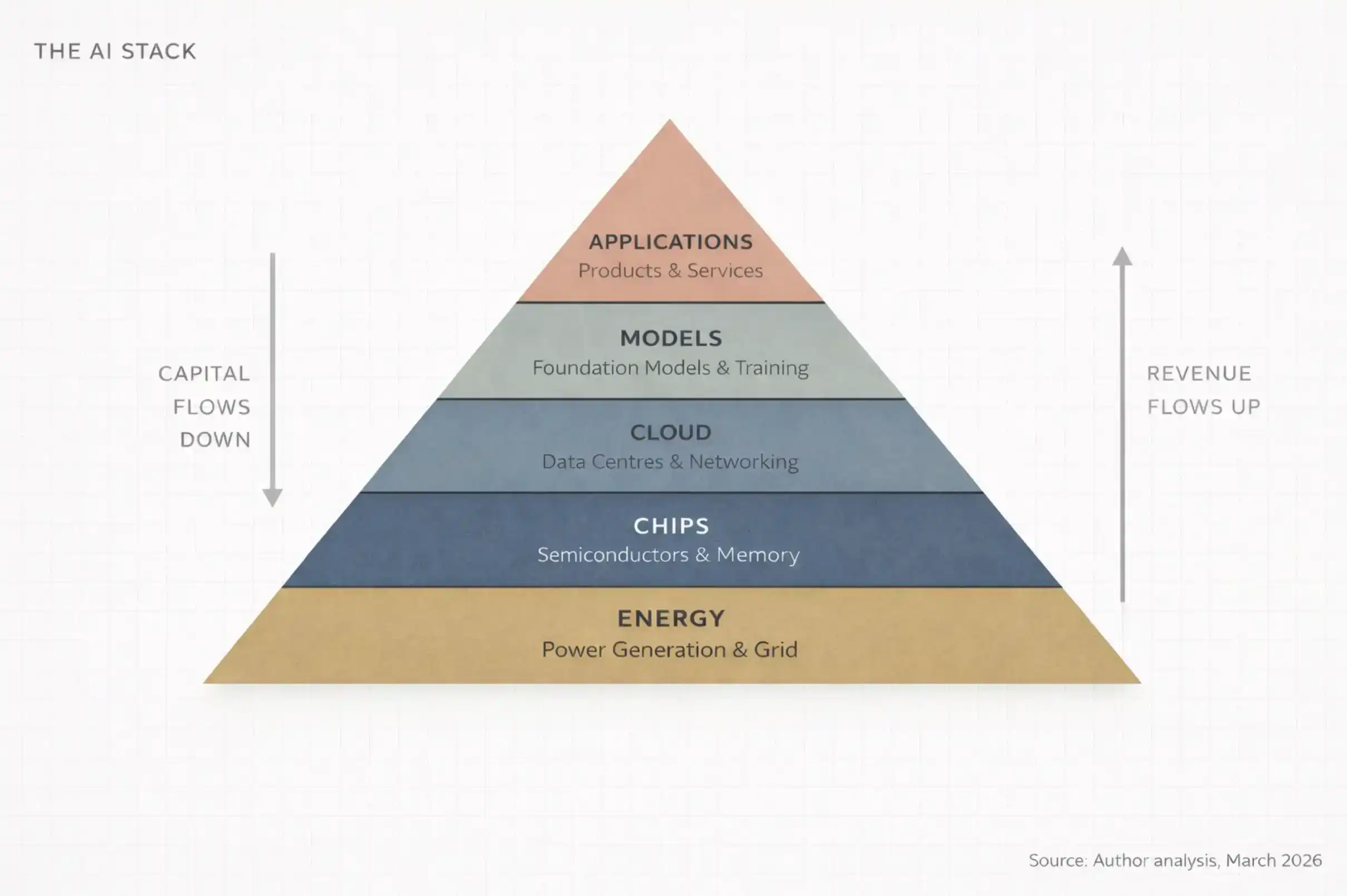 This is layers one to three: Energy, Chips, Cloud Infrastructure. These are the invisible layers, and where truly massive capital is being deployed.