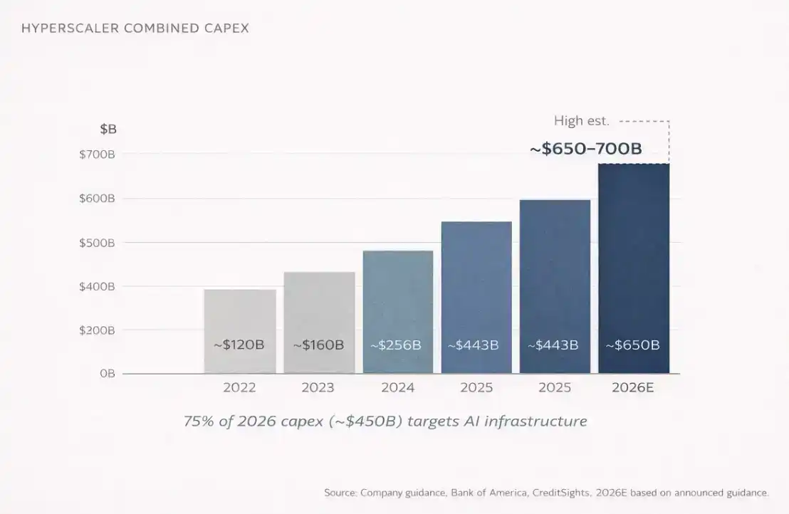 But most people overlook one thing. By 2026, the combined annual capital expenditures (CapEx) of the world's four largest cloud computing companies (Amazon, Microsoft, Google, Meta) are projected to reach $650 to $700 billion.