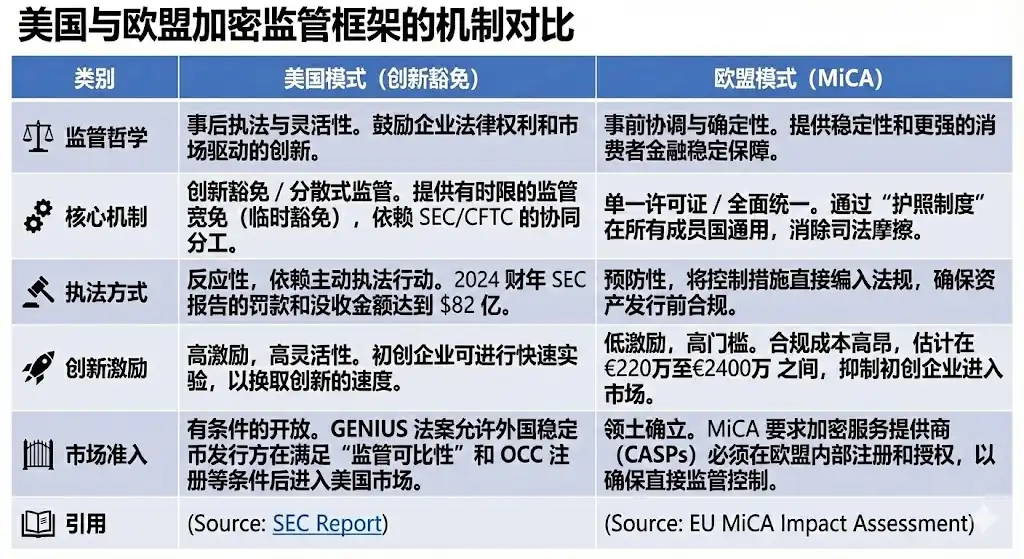 The SEC's Innovation Exemption and the more flexible U.S. model form one pole of global digital asset regulation, contrasting sharply with the ex-ante coordinated and unified model represented by the EU's MiCA (Markets in Crypto-Assets Regulation), with significant philosophical and operational differences between the two.