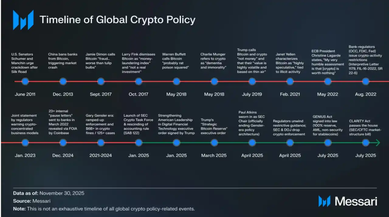 Reviewing past cycles of the crypto industry, policy and regulation have always been important exogenous variables affecting market expectations, but their mode of action changed fundamentally in 2025. Unlike the laissez-faire growth of 2017, the宽松放任 (lenient laissez-faire) of 2021, and the comprehensive suppression of 2022–2024, what 2025 presented was an institutional shift from suppression to permission, from ambiguity to standardization.