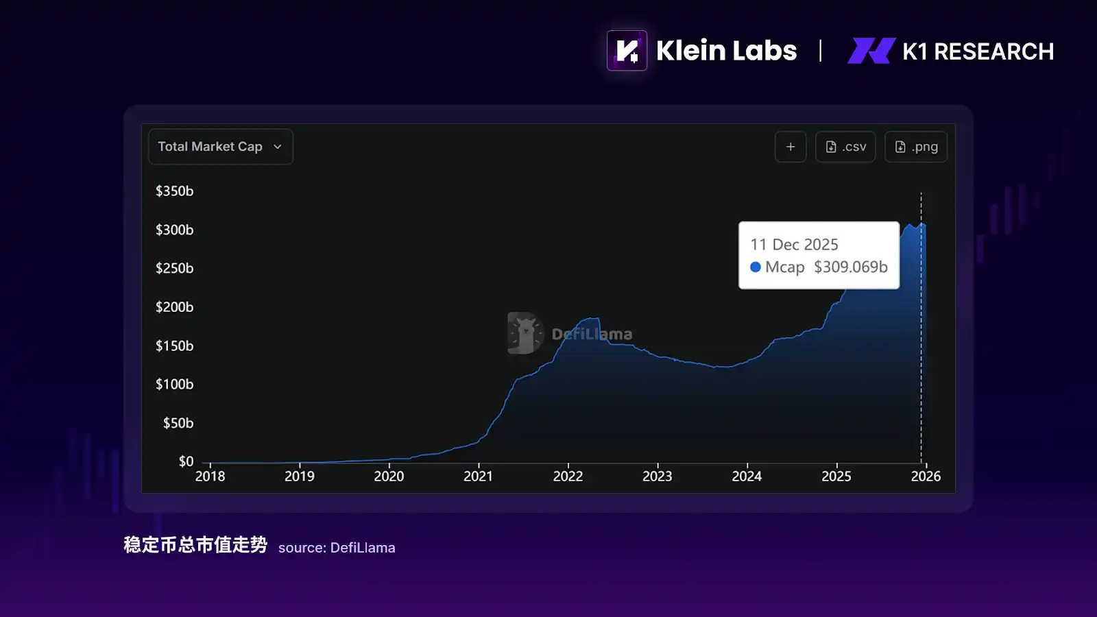 Stablecoins played a completely different role in this process compared to previous cycles. In the past, stablecoins were seen more as "intermediary currencies" within exchanges or leverage fuel in bull markets, their growth often highly correlated with speculative activity. In 2025, stablecoins gradually evolved into instruments for capital parking and settlement. The total stablecoin market cap grew from about $200 billion at the beginning of the year to over $300 billion by year-end, with a yearly increase of nearly $100 billion, but the overall market cap of alt assets did not expand simultaneously. Meanwhile, the annual on-chain settlement volume of stablecoins reached trillions of dollars, even nominally exceeding the annual transaction volume of traditional card networks. This shows that the growth of stablecoins in 2025 came mainly from payment,清算 (clearing), and capital management demands, rather than speculative leverage.