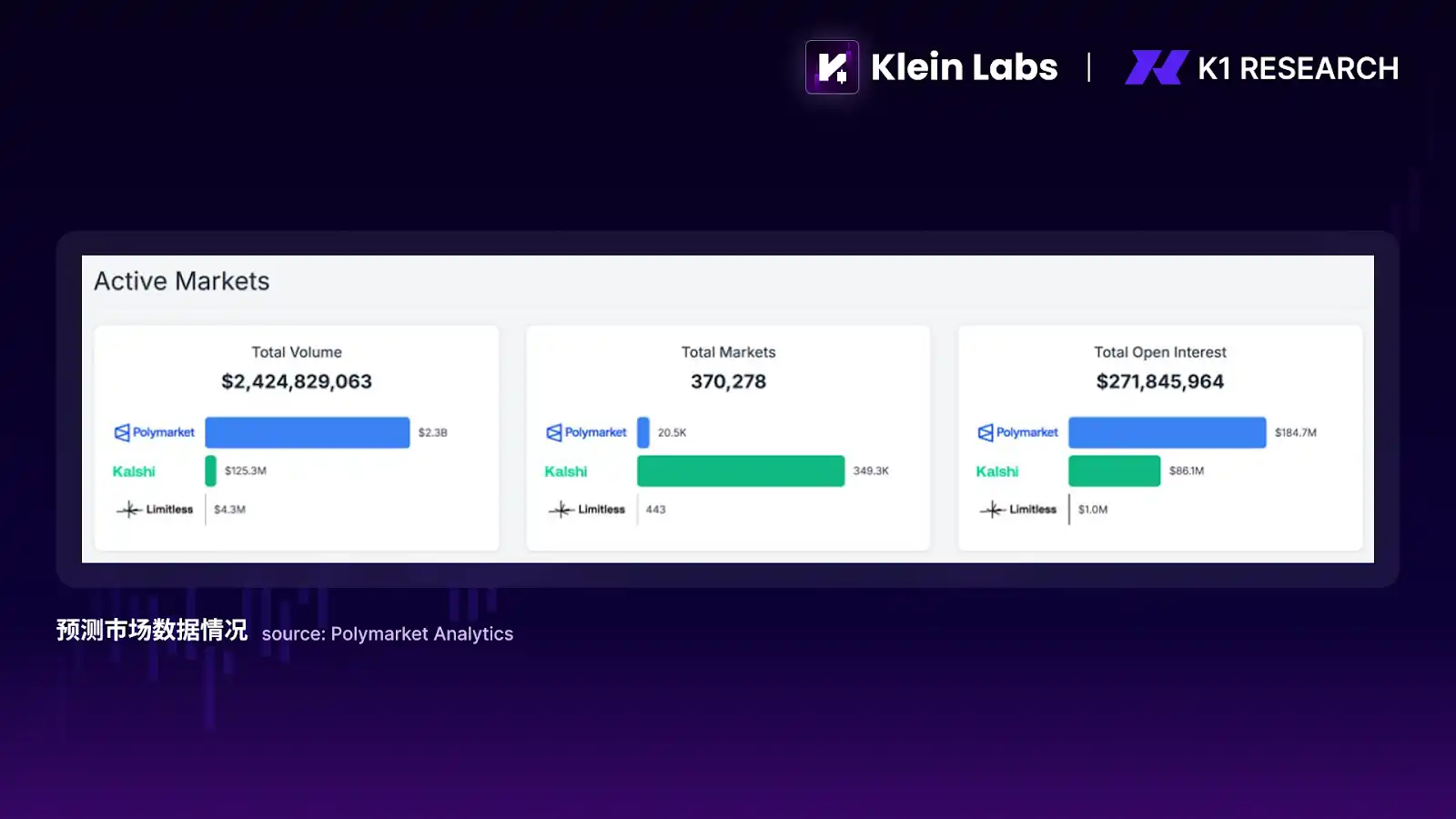 The essence of prediction markets is information aggregation. Capital "votes" on future events through betting行为 (behavior), and the price continuously corrects to approach collective consensus. Structurally, this is a naturally existing and relatively more compliant "casino form": there is no house manipulating odds, outcomes are determined by real-world events, and the platform only profits by charging fees. This sector's first high-profile appearance was during the US presidential election. Prediction markets围绕选举结果 (surrounding the election results) quickly gathered liquidity and public attention on-chain, elevating them from边缘 DeFi 产品 (fringe DeFi products) to a narrative direction with real influence. In 2025, this narrative did not fade but continued to发酵 (ferment) as infrastructure maturity improved and multiple protocol token issuance expectations arose. From a data perspective, prediction markets in 2025 were no longer小众实验 (niche experiments). The cumulative transaction volume of prediction markets had exceeded $2.4 billion. Meanwhile, the全市场未平仓合约 (total market Open Interest) remained at around $270 million, indicating this was not short-term博弈流量 (gaming traffic) but that there was truly capital持续承担 (continuously bearing) event outcome risk.
