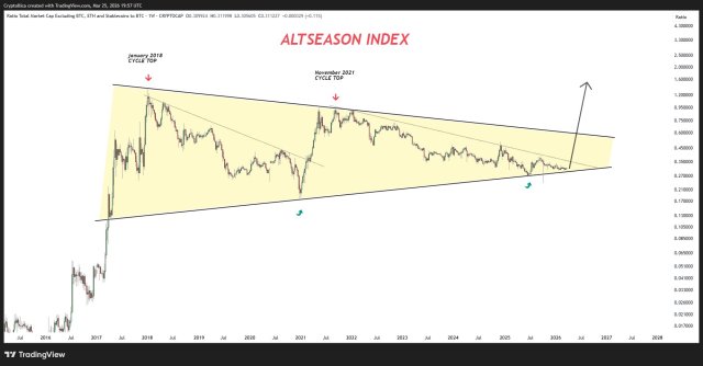 Cryptollica pointed out that the total altcoin market cap has actually been compressed inside this massive wedge since 2018. This would mean that it has been this way for more than seven years, and that even the explosive altcoin season that was experienced in 2021-2022 also happened inside of this massive wedge.