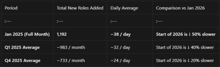 In the first two weeks of January 2025, the average number of daily job postings was about 38; in the same period of 2026, the average number of daily job postings was only about 6.5.