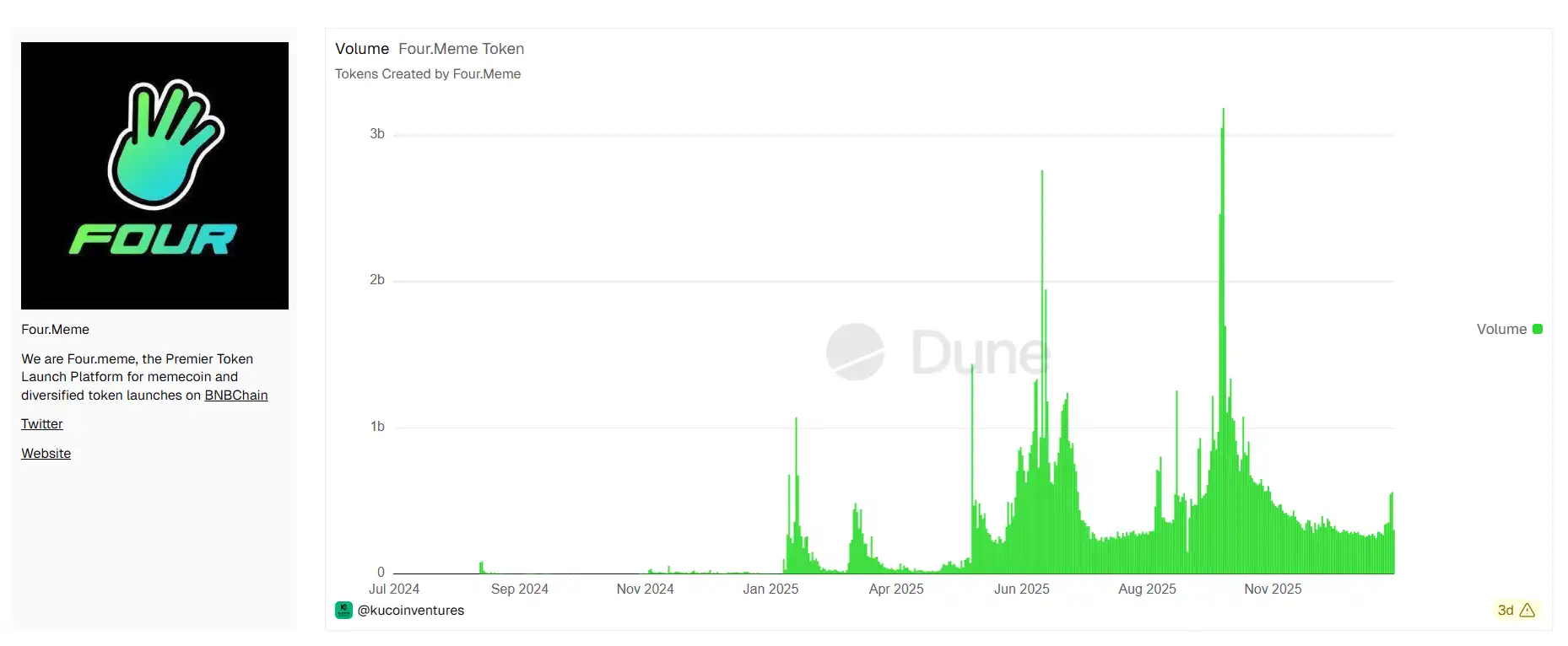 BSC chain's Meme trading volume, on the other hand, repeatedly hit new highs around October 2025: on October 7, 2025, BSC chain Meme coin-related trading volume soared to about $6.05 billion. Four.meme itself also reached a daily average trading volume in the tens of millions of dollars in October, on par with Pump.fun. However, BSC Meme trading presents a "volcanic eruption" pattern—extreme volume spikes in a short time, followed by a rapid decline. For example, during the two-day行情 of Chinese Memes in early January 2026, the 24H trading volume of related coins暴涨 several times, then骤减 by over 50%. Solana Meme is relatively more平稳持久; although there were also huge trading volumes during peak periods, the decline curve is more gradual, and platform revenue remained above bear market averages until the end of 2025. This reflects that the Solana Meme ecosystem has cultivated a group of resident speculators, forming a fixed sector effect that no longer relies entirely on overall market sentiment fluctuations. The BSC Meme ecosystem is still in the trial stage of爆发-cooling, with obvious seasonal characteristics.