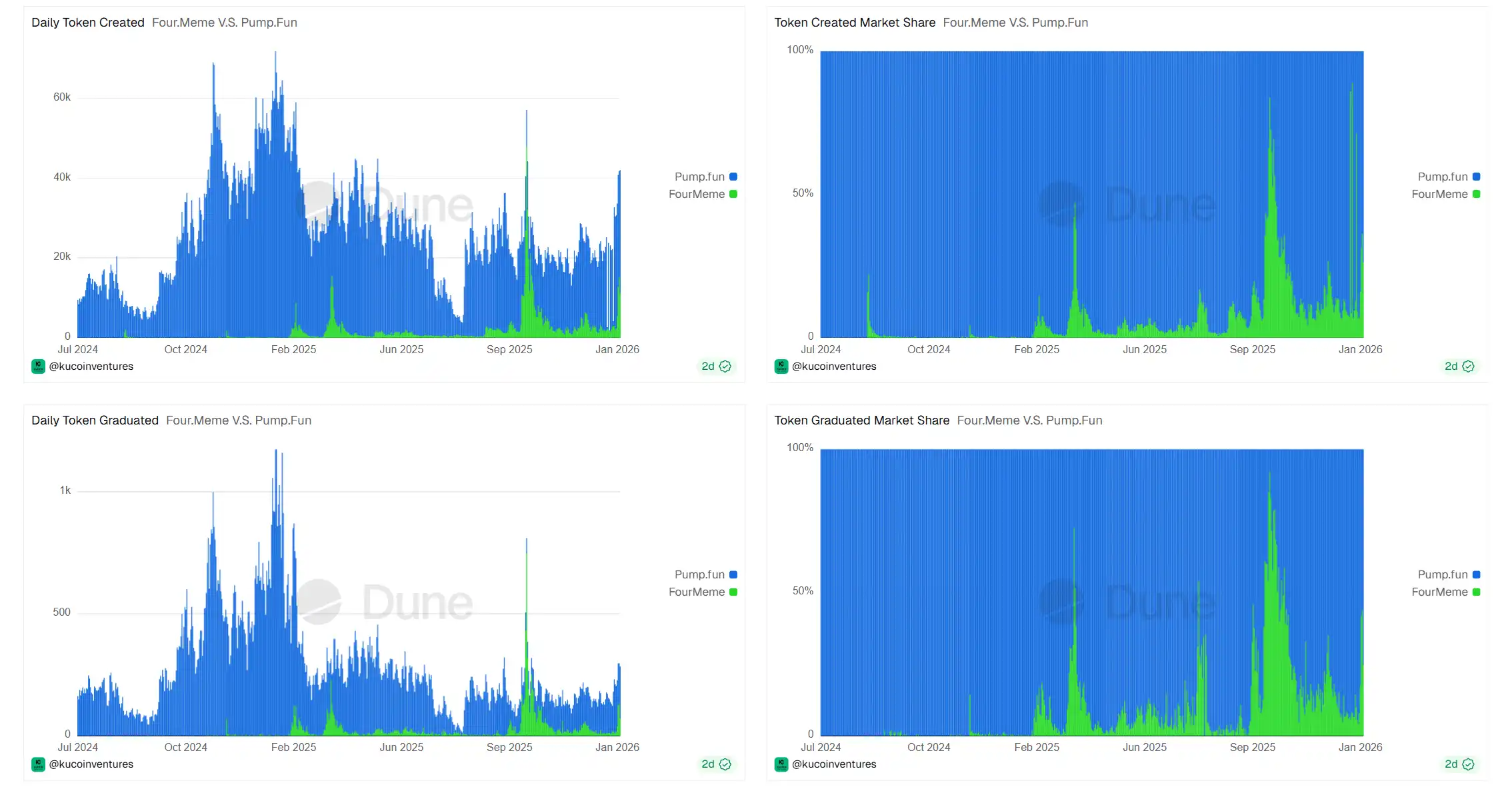 As the representative Meme Launchpads for Solana and BSC respectively, the competition between Pump.fun and Four.meme has run throughout the entire Meme热潮 cycle. Pump.fun won with its first-mover advantage, establishing a垄断地位 early in the Meme wave's inception in 2024, with daily new accounts once exceeding 100,000, making it almost an unavoidable issuance platform on the Solana chain. Four.meme, backed by the Binance ecosystem, emerged rapidly in 2025, growing from less than 500 daily新增 to over 20,000. Although its scale was initially only 40% of Pump.fun's, its weekly growth rate reached a staggering 325%, showing strong latecomer momentum. The two chased each other throughout 2025, with market share seesawing multiple times. The competition between Pump.fun and Four.meme is essentially a battle for capital and users between the Solana and BSC ecosystems. Besides these two giants, other Meme launch platforms or tools have emerged. For example, Solana has competitors like LetsBonk and Moonshot. On the BSC side, the Four.meme platform dominates, consolidating the Meme ecosystem infrastructure on the BSC chain.