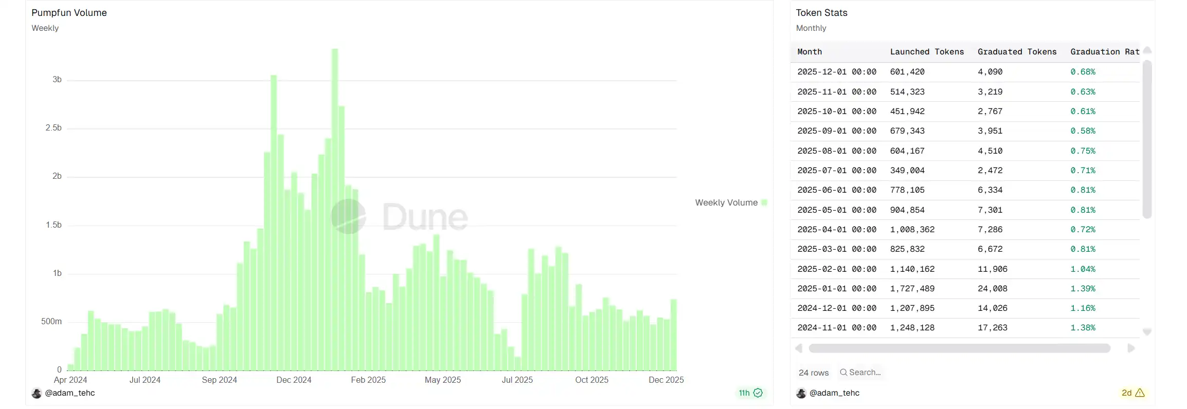 Since Pump.fun launched on Solana in 2024 and ignited the "Meme Summer," Meme tokens have become the hottest on-chain phenomenon. This platform significantly lowered the barrier to token creation. Although the graduation rate is less than 2%, it once contributed about 70% of new token issuances on Solana, pushing Solana's activity to its peak. In early 2025, BSC began to actively embrace the Meme热潮, with tokens related to TST, Broccoli, mubarak, etc., driving traffic on Four.meme to soar. By mid-2025, a capital rotation formed between Solana and BSC. BSC saw a爆火 in "Chinese Memes" in the fourth quarter, such as "Binance Life" and "Hakimi," driving cross-cultural FOMO; however, most projects plummeted to zero starting late October. In early 2026, Chinese Memes like "I'm F*cking Coming," "Life K-Line," "Laozi," and "Dark Horse" surged again but明显 lacked staying power and have since significantly retreated from their highs.