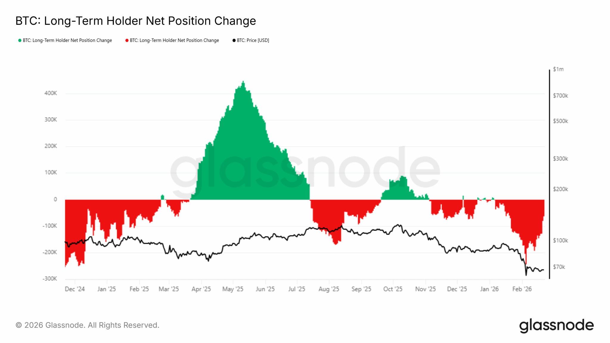 The Long-Term Holder Net Position Change measured the 30-day change in supply in control of long-term holders (holders of BTC aged at least 155 days). The massive negative spike on the 5th of February saw 244,866 BTC flow from the LTH supply.