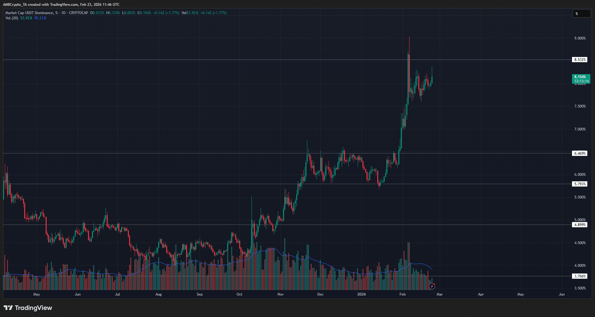 The USDT Dominance reflects the USDT market cap as a percentage of the total crypto market cap. Rising USDT.D trends imply crypto prices are trending downward, and market participants feel safer on the sidelines, holding stablecoins.