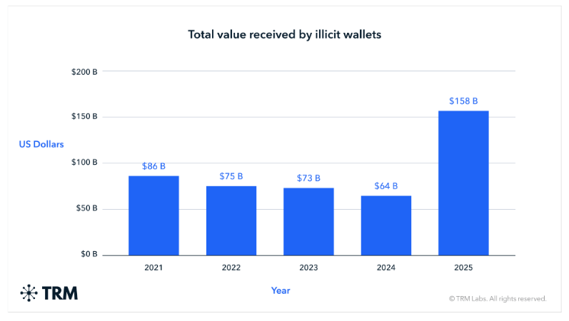 Illicit inflows to crypto assets reached a record high of $158 billion, a substantial increase due to improved monitoring that brought more illicit activity to light.