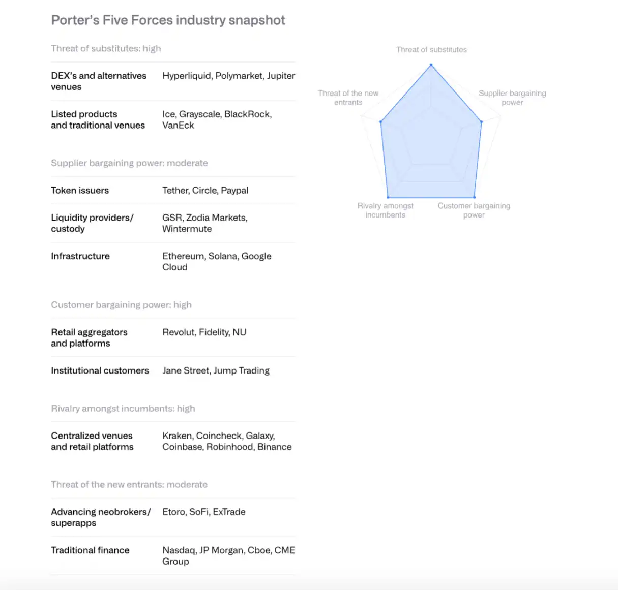 Threat of Substitutes: Decentralized exchanges like Hyperliquid, prediction markets like Polymarket, and CME crypto derivatives pose competition.