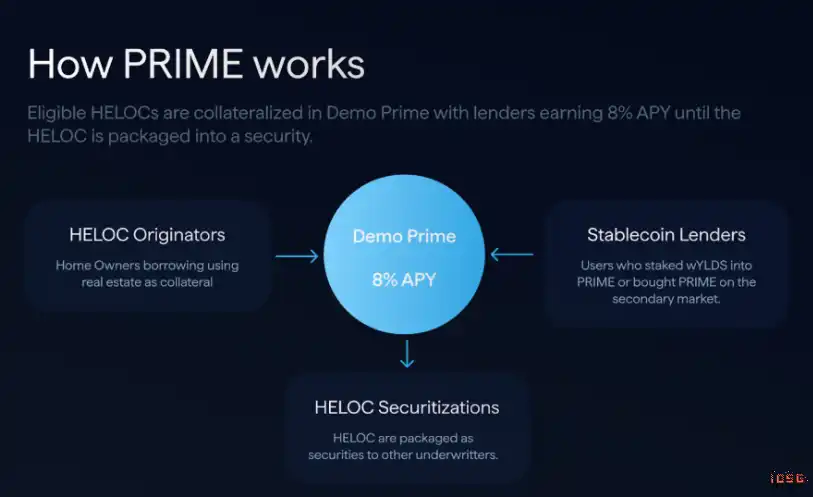 This will prompt stablecoins to incorporate a wider range of RWA assets into their underlying assets, thereby making their underlying assets more diversified. Figure's PRIME is a typical case of on-chaining HELOC yields. HELOC (Home Equity Line of Credit) is a loan that allows homeowners to borrow, spend, and repay on demand using their home as collateral. PRIME token holders provide funding for HELOC loans, with a fixed yield of 8%.