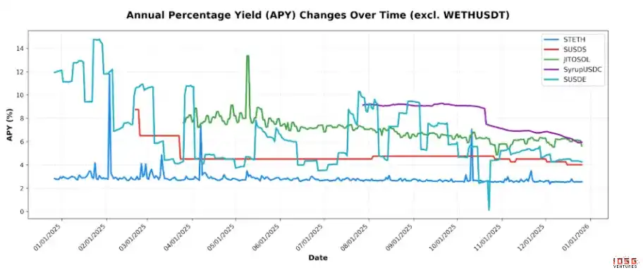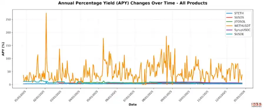 The APY of the WETH/USDT pool and stETH was relatively stable across different market environments. The APY of JitoSOL, SyrupUSDC, sUSDE, and sUSDS all decreased, with sUSDE and SyrupUSDC seeing significant drops. The chart also shows that products with higher APY also have higher volatility. The APY of sUSDS is more governance-driven than market-driven, so it remained stable most of the time.