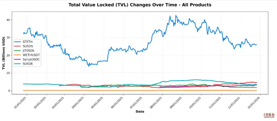 Looking at TVL data, the TVL of all products increased during the bull market. But in the bear market, the TVL of stETH, sUSDE, and JitoSOL decreased, while the TVL of sUSDS and SyrupUSDC increased.