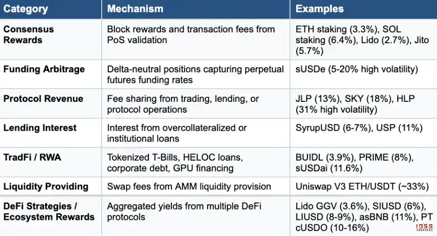 On-chain yields have eight different mechanisms, each with different returns, risks, and sensitivity to market influences:
