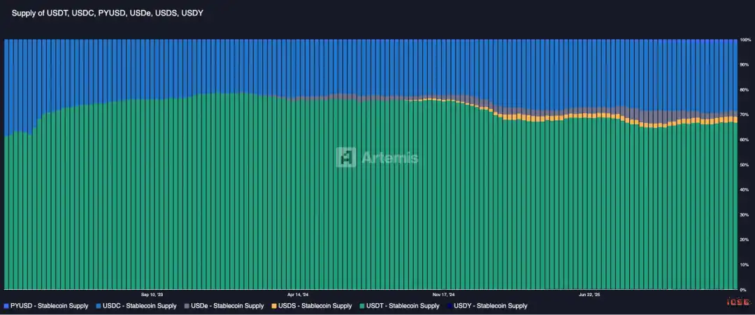 In the past, with treasury yields at 4%, stablecoins were an excellent cash flow business. However, yield-bearing stablecoins are products that share almost 100% of the treasury yield with users, which poses some challenges to traditional stablecoins. Since 2024, the market share of yield-bearing stablecoins has been steadily rising. If we look at the supply of the top three native yield stablecoins and the top three non-native yield stablecoins (USDT, USDC, PYUSD, USDe, USDS, USDY), the market share of native yield stablecoins has risen from 0.1% to 7.6%, peaking at 11.5%.