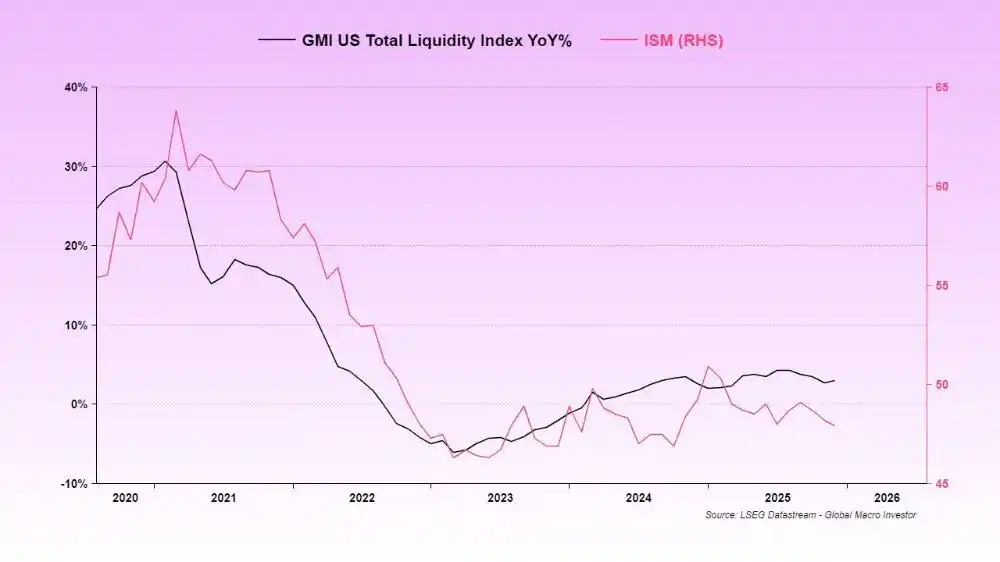 In this cycle, the GMI Global Total Liquidity index is leading the US Total Liquidity index and is about to rebound (and thus will also drive the ISM index).