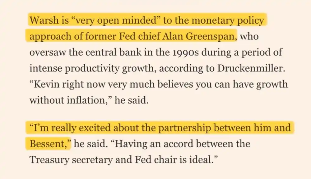 The above shows "investment guru" Stanley Druckenmiller's content on Warsh's monetary policy philosophy and his agreement with Besant upon becoming Fed Chair.