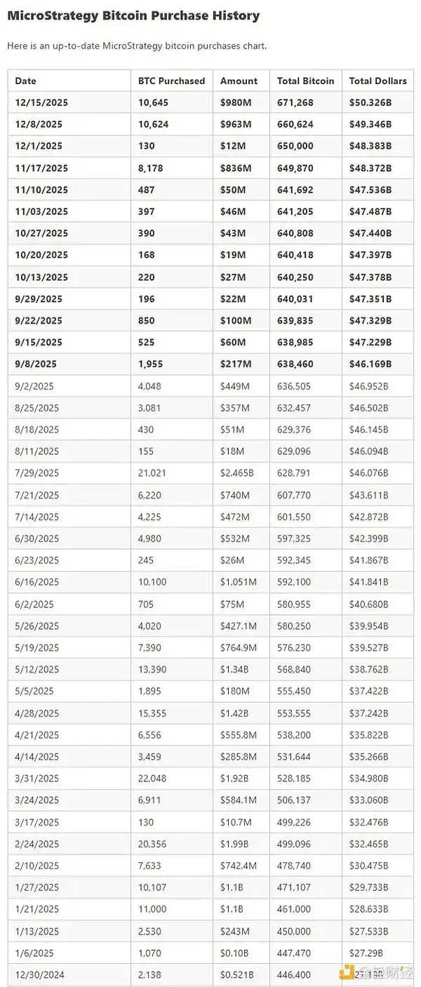 30 de diciembre de 2024: Las tenencias totales de BTC de MicroStrategy eran de 446,400; al 15 de diciembre de 2025, las tenencias totales de BTC de MicroStrategy son de 671,268. En casi un año, MicroStrategy compró 224,868 BTC. Sus tenencias representan el 3.197% del suministro total de BTC.