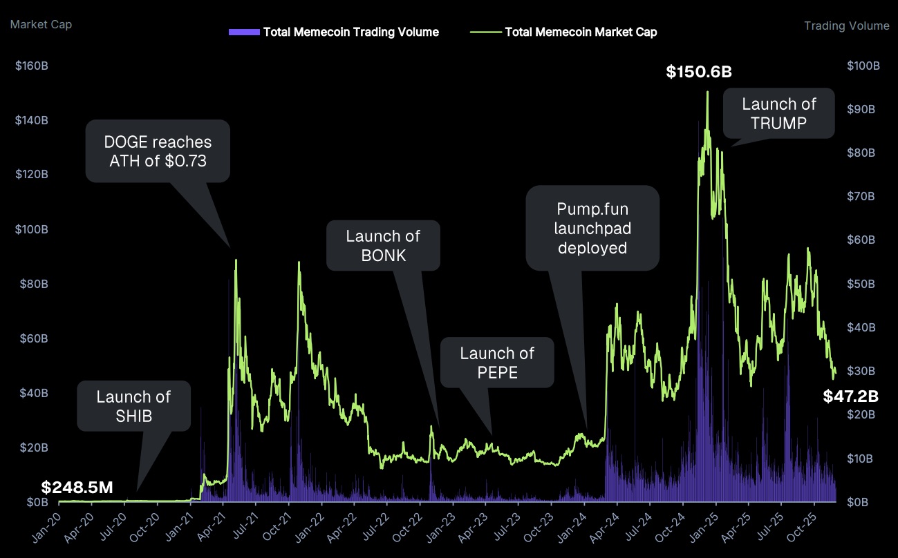 AThe peak market capitalization of memecoins in 2025 was $150 billion. By November, it had fallen to $47.2 billion, representing a decline of over $100 billion.