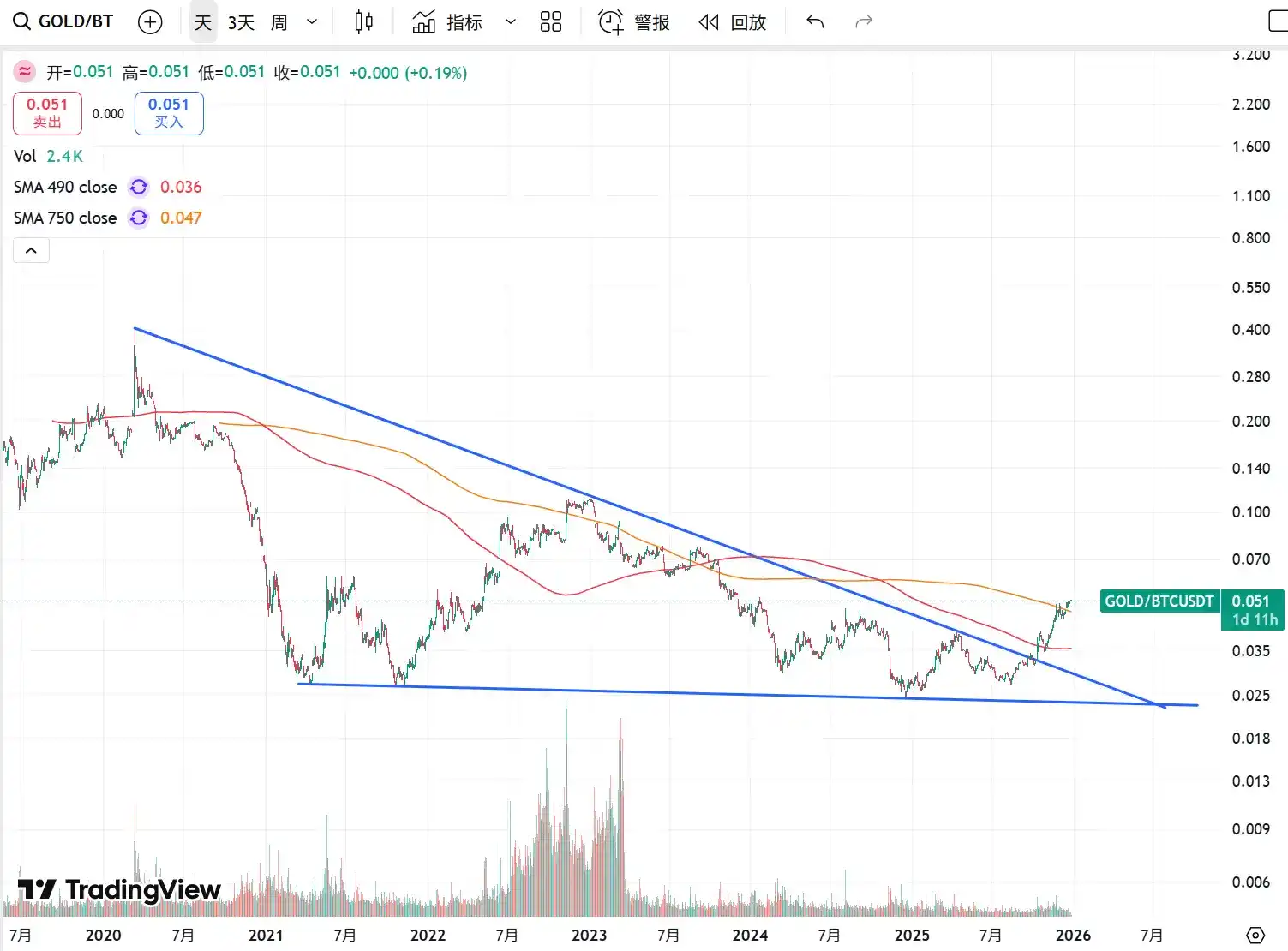 Compared to the crypto market, the recent protagonist in the capital markets has been precious metals. The Q4行情 (market trend/action) anticipated within the circle did happen, but it was usurped by silver—the monthly trading volume of silver on the Shanghai Silver Exchange alone has now exceeded 7,500 billion RMB, and the open interest in options on COMEX is several times the actual market inventory. This frenzy is reminiscent of the crypto market in 2020-2021, and in contrast, Bitcoin's lethargic state is lamentable. Specifically, since October, the relative price strength of gold versus Bitcoin has also broken through the long-term downward trend channel since the 2020 easing, making this high-level capital rotation even more直观 (intuitive/visually clear).