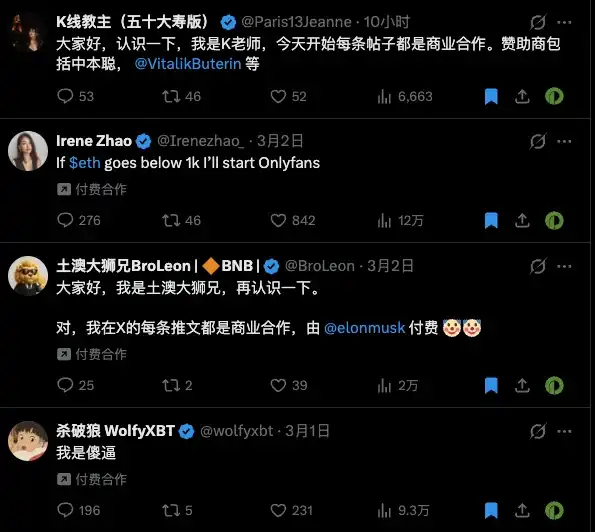 The force of the new rules will ultimately feedback into the income of crypto KOLs. The various soft ads that KOLs previously cooperated on with project parties are no longer feasible. Some major KOLs are collectively making abstract memes, labeling abstract content with "Paid Partnership" as a form of protest against X platform's new paid content policy.