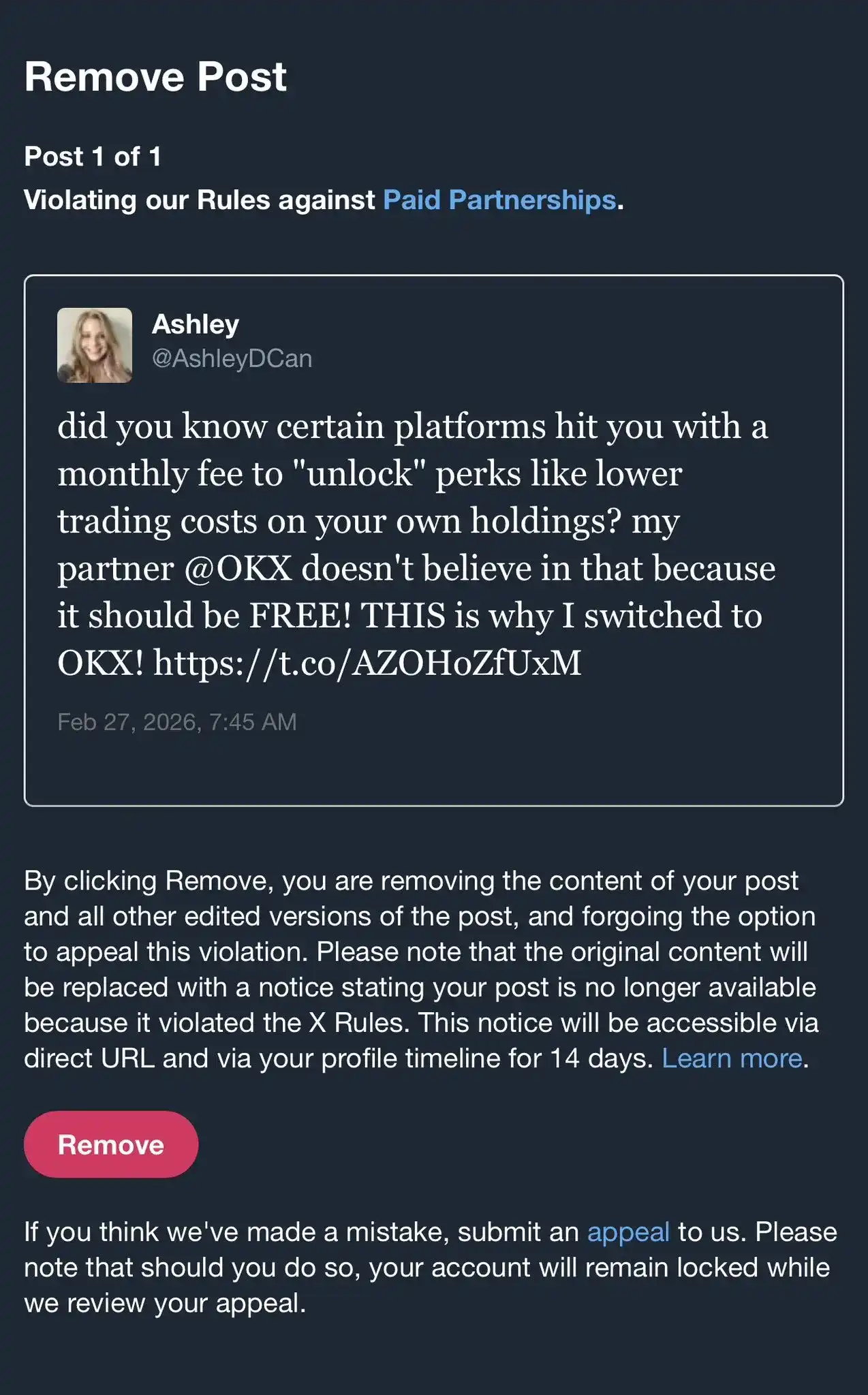 X required Ashley to delete the post promoting OKX