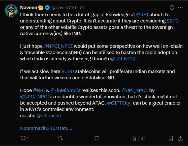 加密社区认为,比特币和稳定币对印度卢比构成的威胁微乎其微。一位用户甚至称央行对加密货币的理解已经过时。