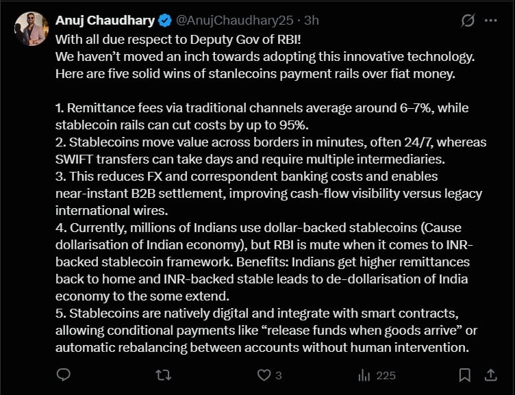 一位用户指出,印度人已经在使用稳定币进行更快、更便宜的汇款,与传统渠道相比,费用通常大幅降低。