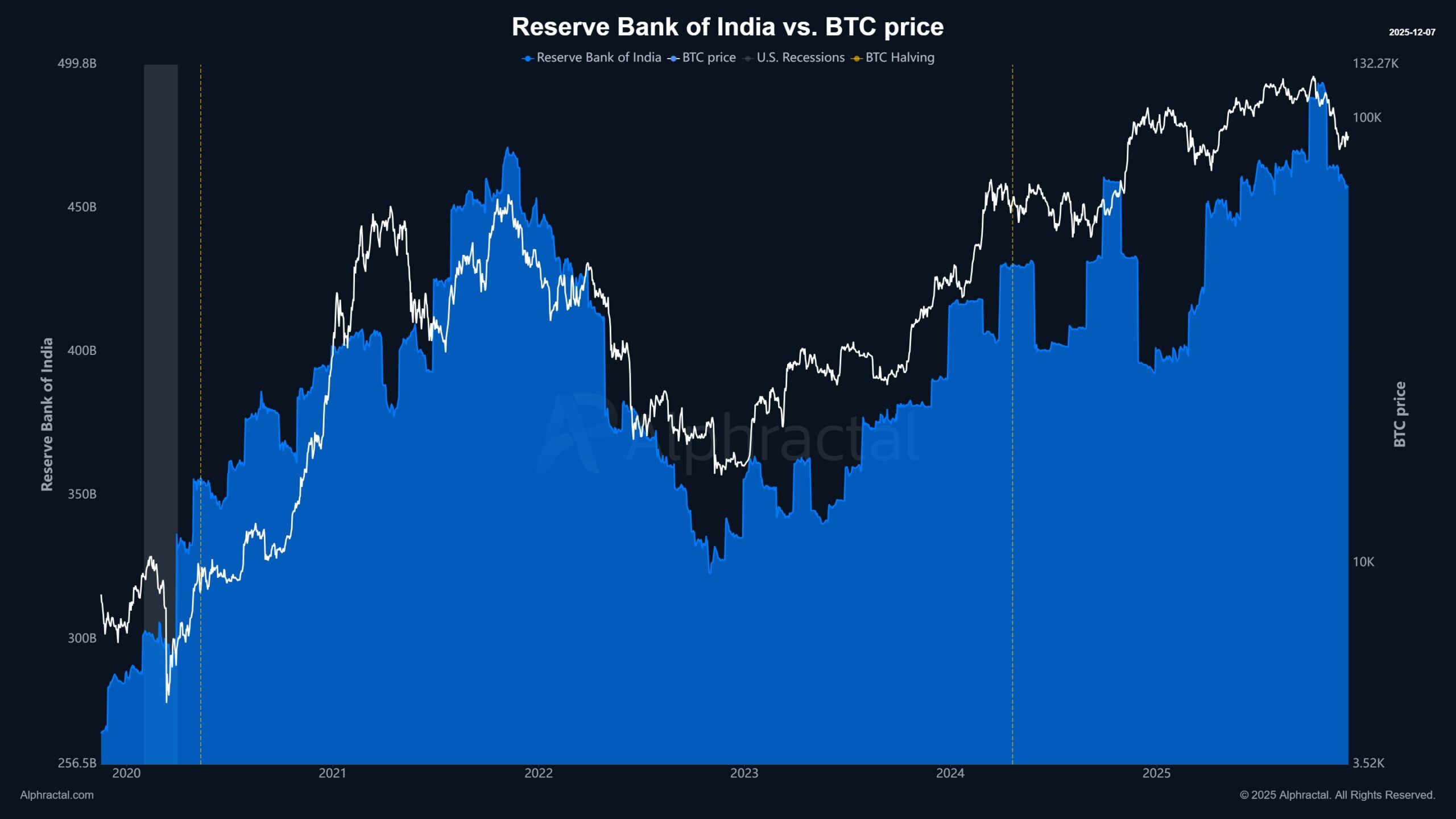尽管公开对比特币持否定态度,但印度央行的资产负债表变动与比特币最大的涨跌周期紧密同步。当印度央行流动性扩张时,比特币往往上涨。当流动性收紧时,比特币走弱。