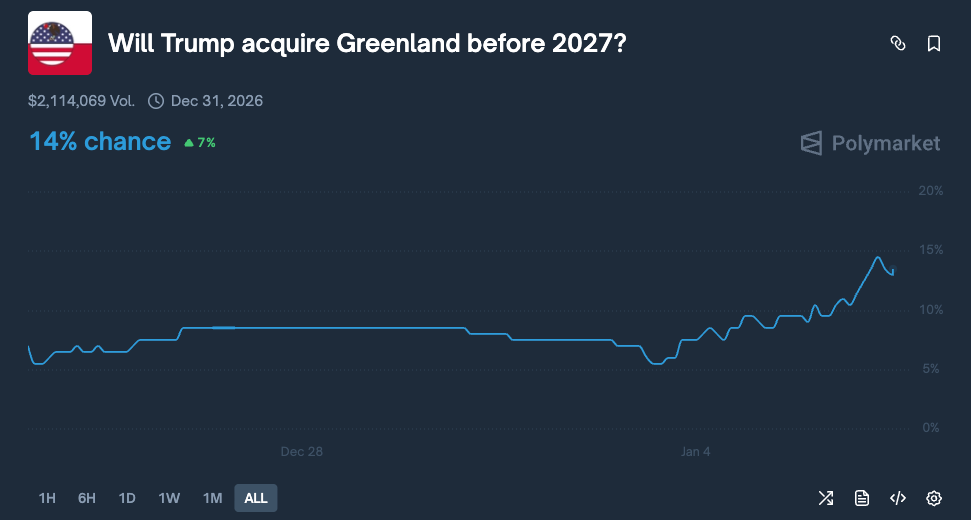 On Polymarket, the market for "Trump 'acquiring' Greenland by 2027" is highly sensitive. The probability in this market rose from about 7% on December 28 to the current 14%, a gain of 7 percentage points, with trading volume exceeding $2.1 million. This rise coincided with the timing of the Venezuela operation.