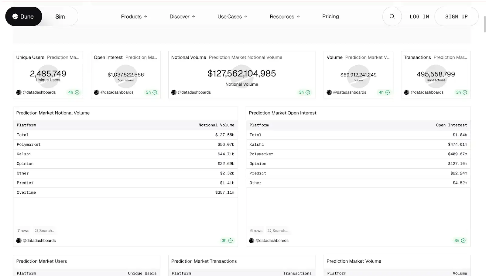 As of February 2026, the total Notional Volume for the prediction market industry was $127.5 billion, actual Volume was $69.9 billion, with 2.49 million unique users, and open interest突破 (breaking through) $1 billion.