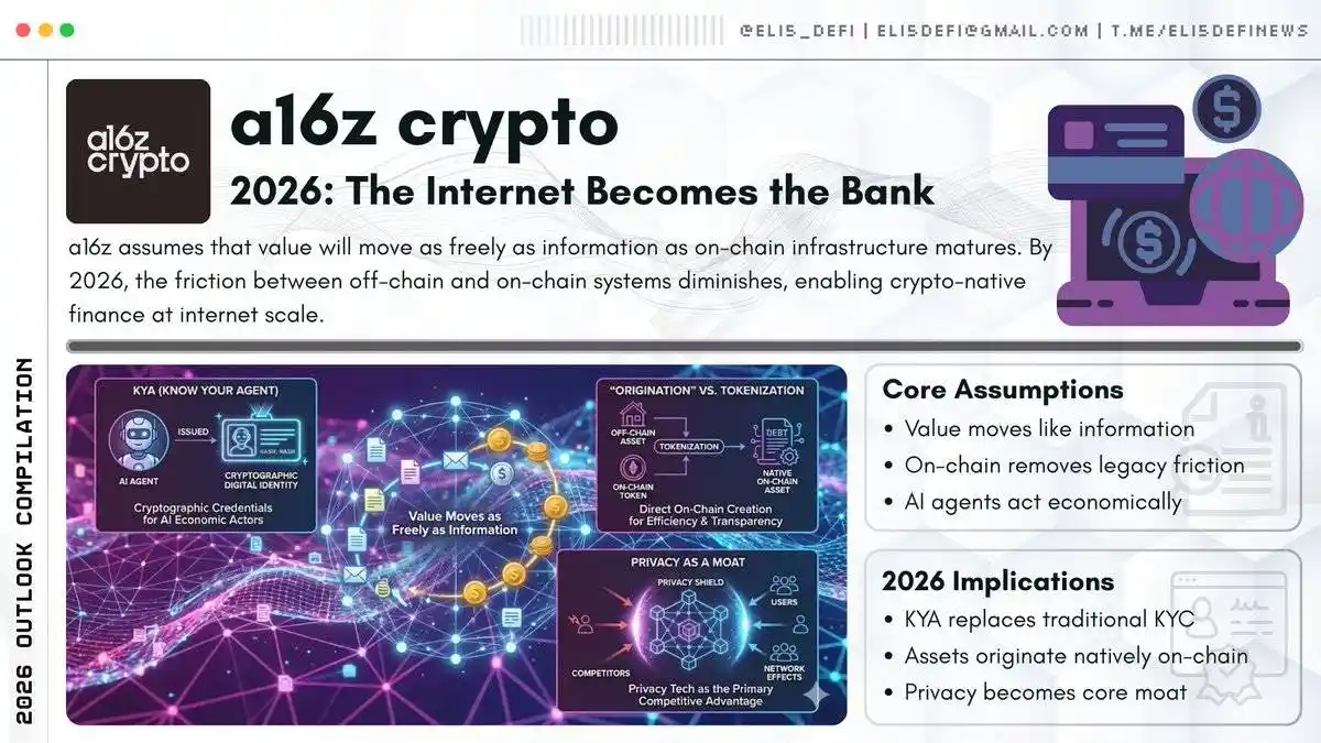 a16z Crypto's outlook is based on a core hypothesis: "The internet becomes the bank." They believe that the flow of value will become as free as the flow of information. The current friction between the on-chain and off-chain worlds is the main bottleneck, and 2026 will be the year this barrier is eliminated through better infrastructure.