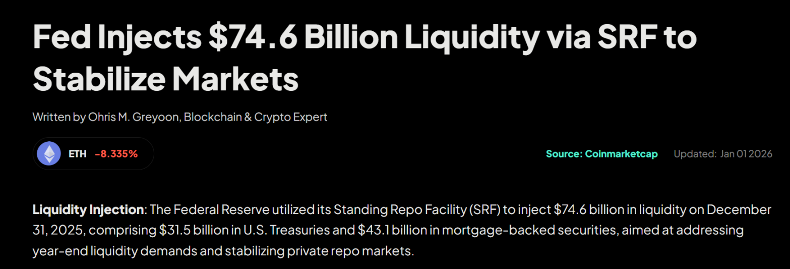 Data shows that on December 31st, banks borrowed a record $74.6 billion from the Fed's emergency lending window (SRF - Standing Repo Facility). This mechanism exists precisely to provide short-term liquidity to eligible financial institutions. Its original design was to prevent funding crises. But the reality is: only specific institutions qualify to use this tool.