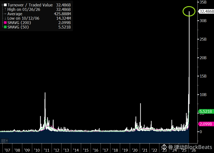 According to VandaTrack data, individual investors poured a record net $1 billion into silver ETFs in January alone. This狂热 (frenzy) peaked on January 26th—trading volume for the silver ETF (SLV) reached a staggering $39.4 billion, almost catching up to the $41.9 billion volume of the S&P 500 ETF (SPY). Remember, this is an ETF for a single metal; its popularity was nearly matching that of the entire US stock market.