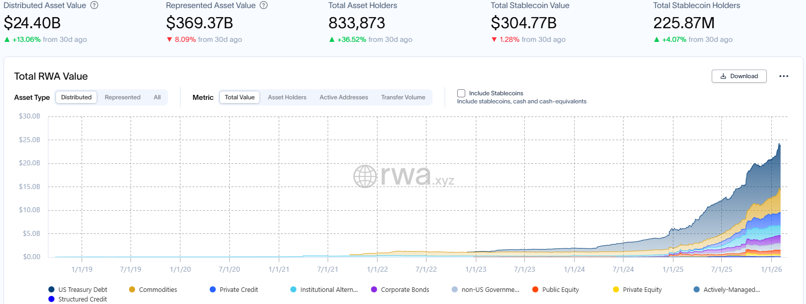 Latest data from RWA.xyz reveals that as of February 6, 2026, the total on-chain RWA market capitalization reached $24.4 billion, up 13.06% month-on-month, maintaining rapid growth. The total number of asset holders increased to approximately 833,900, a significant 36.52% rise month-on-month, indicating that market growth is now driven more by user base expansion than capital scale growth.
