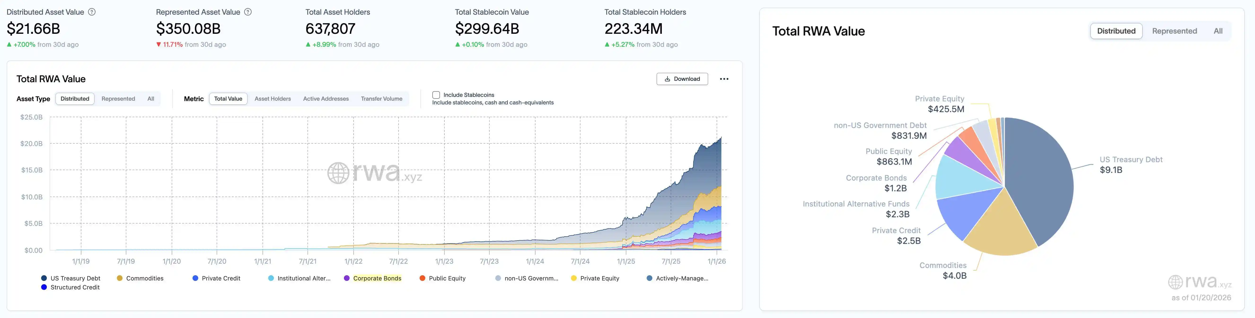 According to rwa.xyz data panel, as of January 20, 2026, the total on-chain value of RWA (Distributed Asset Value) continued its upward trend, growing from $208.1 billion on January 13 to $216.6 billion, a net increase of $8.5 billion in a single week, representing a growth of approximately 4.09% month-on-month. The broad RWA market rebounded this period, rising from $282.68 billion last week to $350.08 billion, an increase of $67.4 billion, a surge of 23.84%. User activity on the asset side also climbed significantly, with the total number of asset holders increasing from 620,073 to 637,807, a net increase of over 17,700 in a single week, a growth of 2.86%. Regarding stablecoins, the number of holders rose from 220.12 million to 223.34 million, an increase of 3.23 million, up 1.47%; the market cap saw a slight increase from $297.68 billion to $299.64 billion, adding $1.96 billion, a growth of 0.66%.