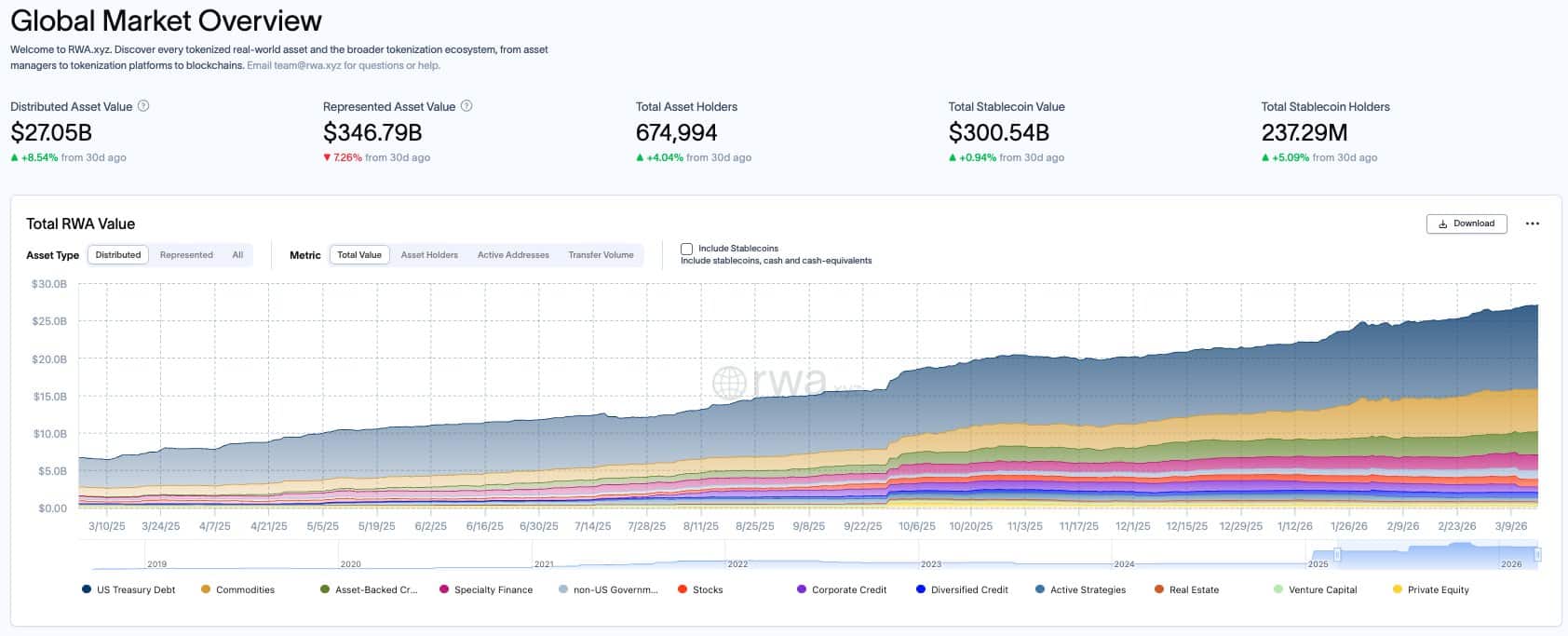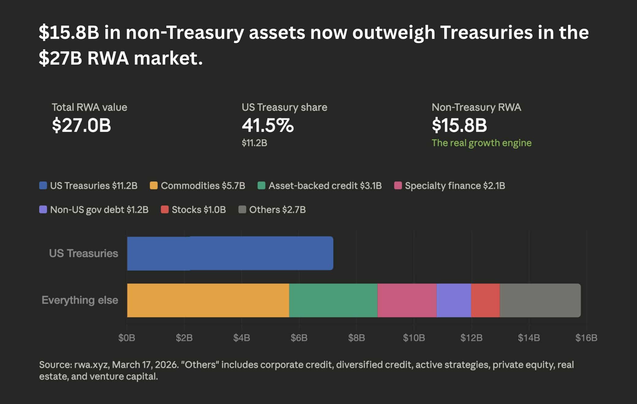 The numbers make that evident. The total RWA market has now crossed $27 billion, with non-Treasury assets accounting for $15.8 billion; overtaking U.S. Treasuries and emerging as the primary growth driver. This includes categories like commodities, asset-backed credit, and specialty finance, alongside tokenized stocks, which have now reached the $1 billion-mark.