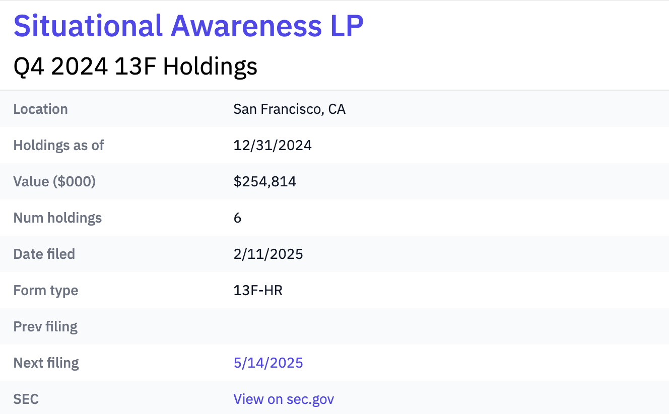 - Hot picks like Nvidia, Microsoft, Amazon, and Google do not appear in the holdings; it seems Situational Awareness LP prefers relatively "less popular" targets.