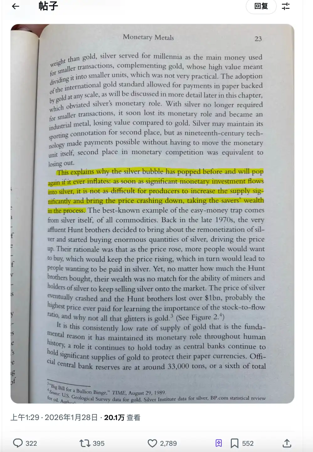 The gist of that highlighted passage is: Silver bubbles have burst before and will burst again. Because once large amounts of money flood into silver, miners can easily increase supply, driving the price down, and evaporating the wealth of savers.