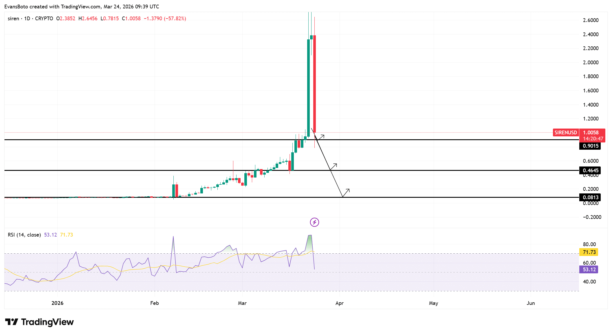 SIREN has already lost the $0.9015 support level, which previously acted as a key reaction zone during the rally. This shift now places $0.4645 as the next major support, while a failure there could expose $0.0813 as the lower historical base.