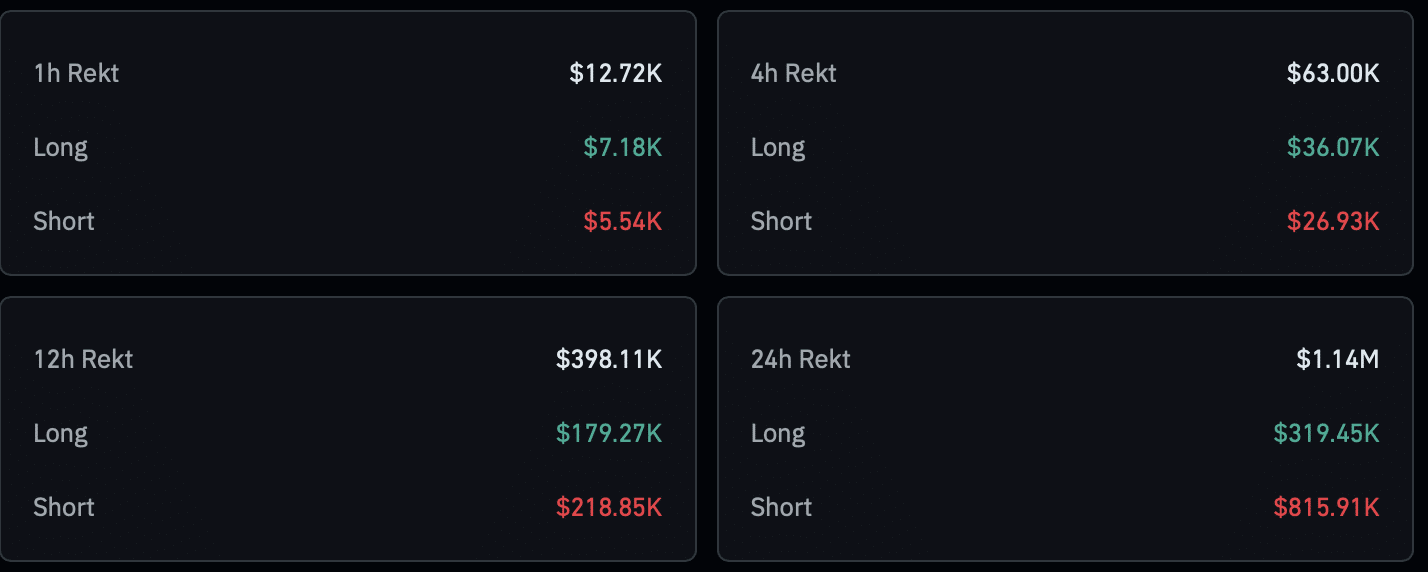 During the same timeframe, short traders recorded higher losses than long traders. CoinGlass liquidation data shows that approximately $817,000 in short positions was liquidated, compared to about $319,000 in long liquidations.