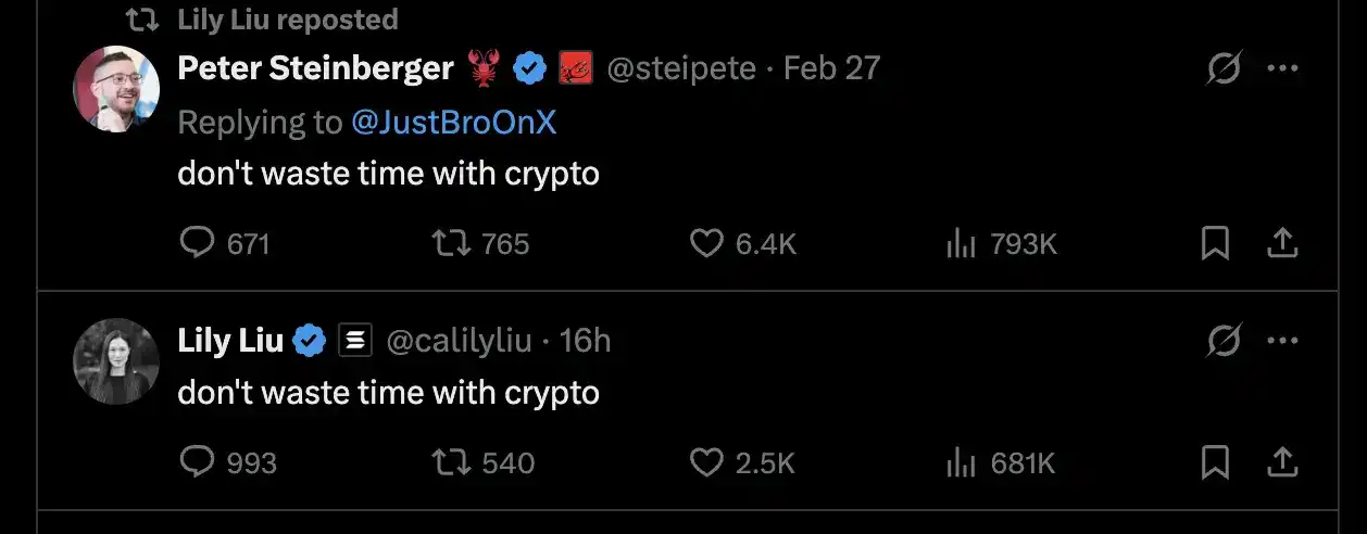 Yesterday, OpenClaw founder Peter Steinberger responded to a user's question on X, 'What advice do you have for people in their 20s?' His answer was just one sentence: 'don't waste time with crypto.' This tweet was subsequently reposted by Solana Foundation President Lily Liu, who also posted the exact same phrase herself.