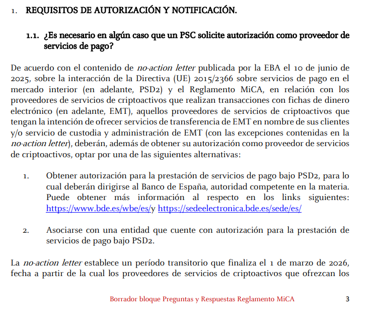 Entities benefiting from the transition must obtain MiCA authorization by that date if they wish to continue providing in-scope crypto-asset services in Spain.