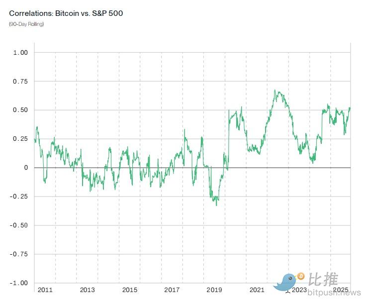 数据显示,比特币与标普 500 的 90 日滚动相关性很少超过 0.5。
