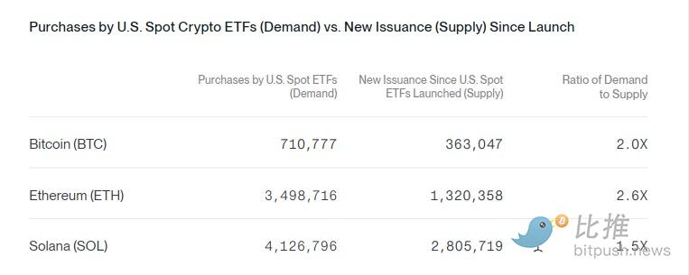 ETF 将买入超过比特币、以太坊和 Solana 新增供给的 100%