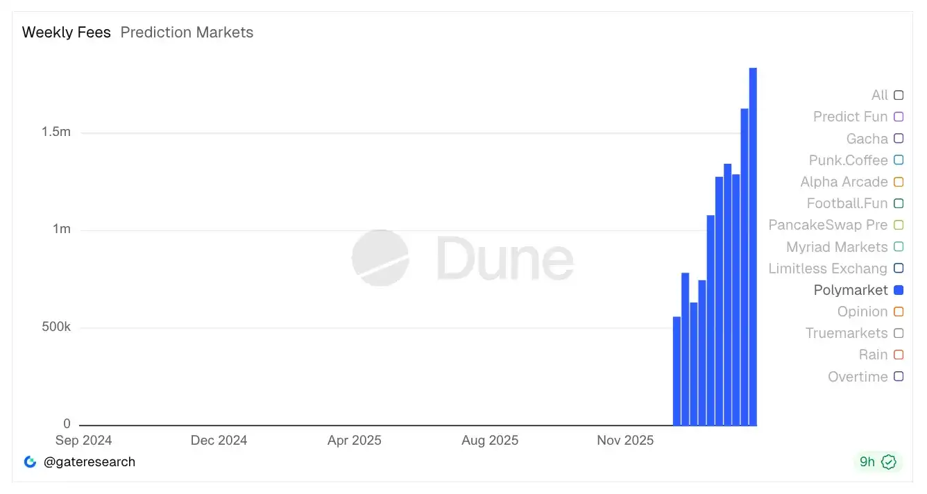 Ngoài ra, theo dữ liệu từ Dune, kể từ ngày 6/1 bắt đầu thu phí giao dịch đối với một số thị trường (bao gồm thị trường NCAA và biến động giá crypto,...), Polymarket đã tích lũy thu được hơn 11,2 triệu USD doanh thu phí. Nói cách khác, Polymarket đã chứng minh đầy đủ khả năng tạo ra lợi nhuận của mình.