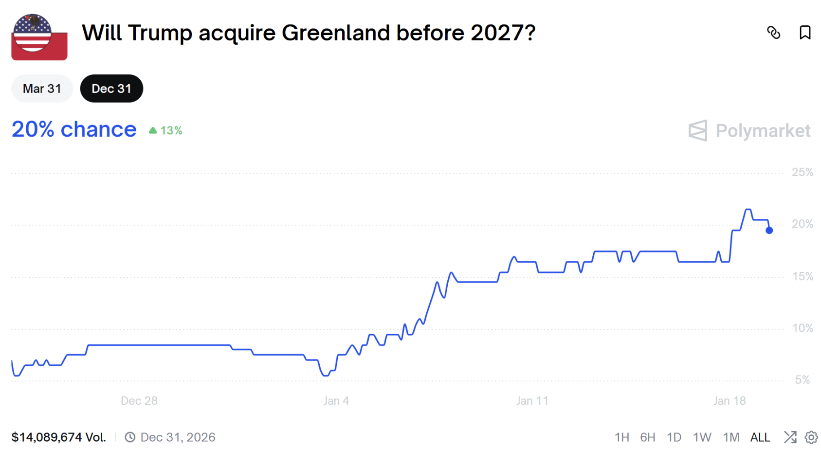 Latest data from Polymarket shows the market is betting a 20% probability that Trump will acquire Greenland by 2027.